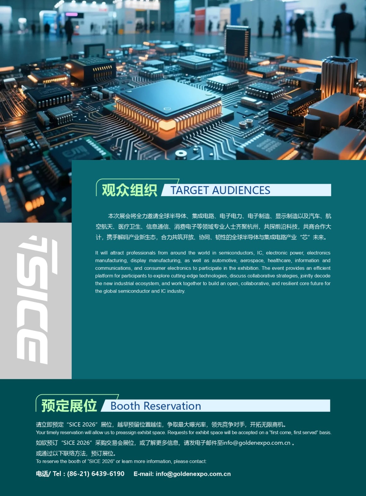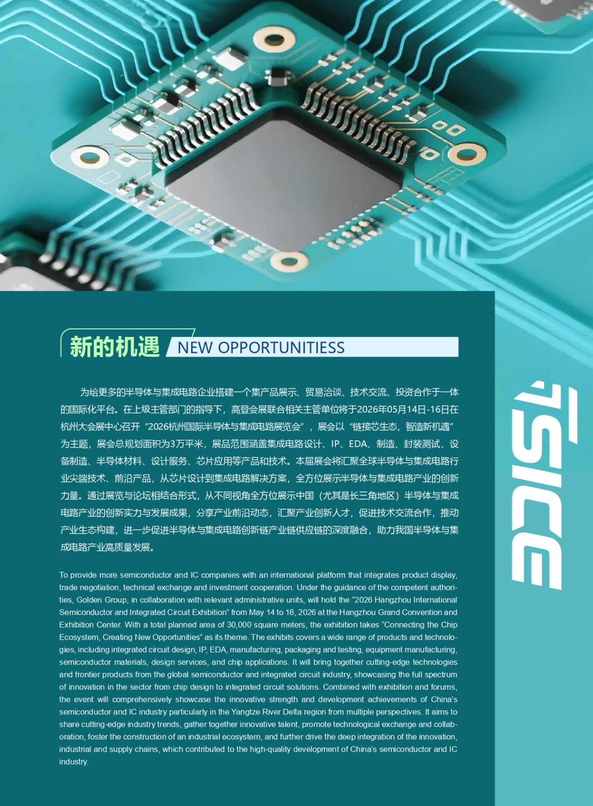 为给更多的半导体与集成电路企业搭建一个集产品展示、贸易洽谈、技术交流、投资合作于一体的国际化平台。在上级主管部门的指导下,高登会展联合相关主管单位将于2026年05月14日-16日在杭州大会展中心召开“2026杭州国际半导体与集成电路展览会”,展会以“链接芯生态,智造新机遇”为主题,展会总规划面积为3万平米,展品范围涵盖集成电路设计、IP、EDA、制造、封装测试、设备制造、半导体材料、设计服务、芯片应用等产品和技术。本届展会将汇聚全球半导体与集成电路行业尖端技术、前沿产品,从芯片设计到集成电路解决方案,全方位展示半导体与集成电路产业的创新力量。通过展览与论坛相结合形式,从不同视角全方位展示中国(尤其是长三角地区)半导体与集成电路产业的创新实力与发展成果,分享产业前沿动态,汇聚产业创新人才,促进技术交流合作,推动产业生态构建,进一步促进半导体与集成电路创新链产业链供应链的深度融合,助力我国半导体与集成电路产业高质量发展。